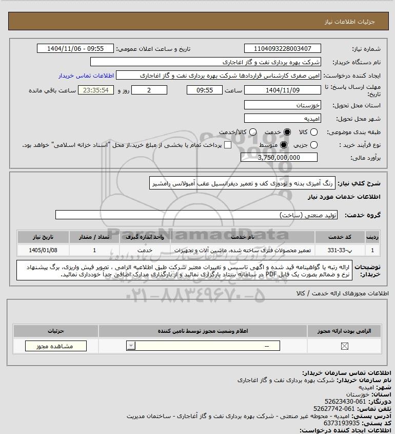 شرح کلی نیاز: رنگ آمیزی بدنه و تودوزی کف و تعمیر دیفرانسیل عقب آمبولانس رامشیر