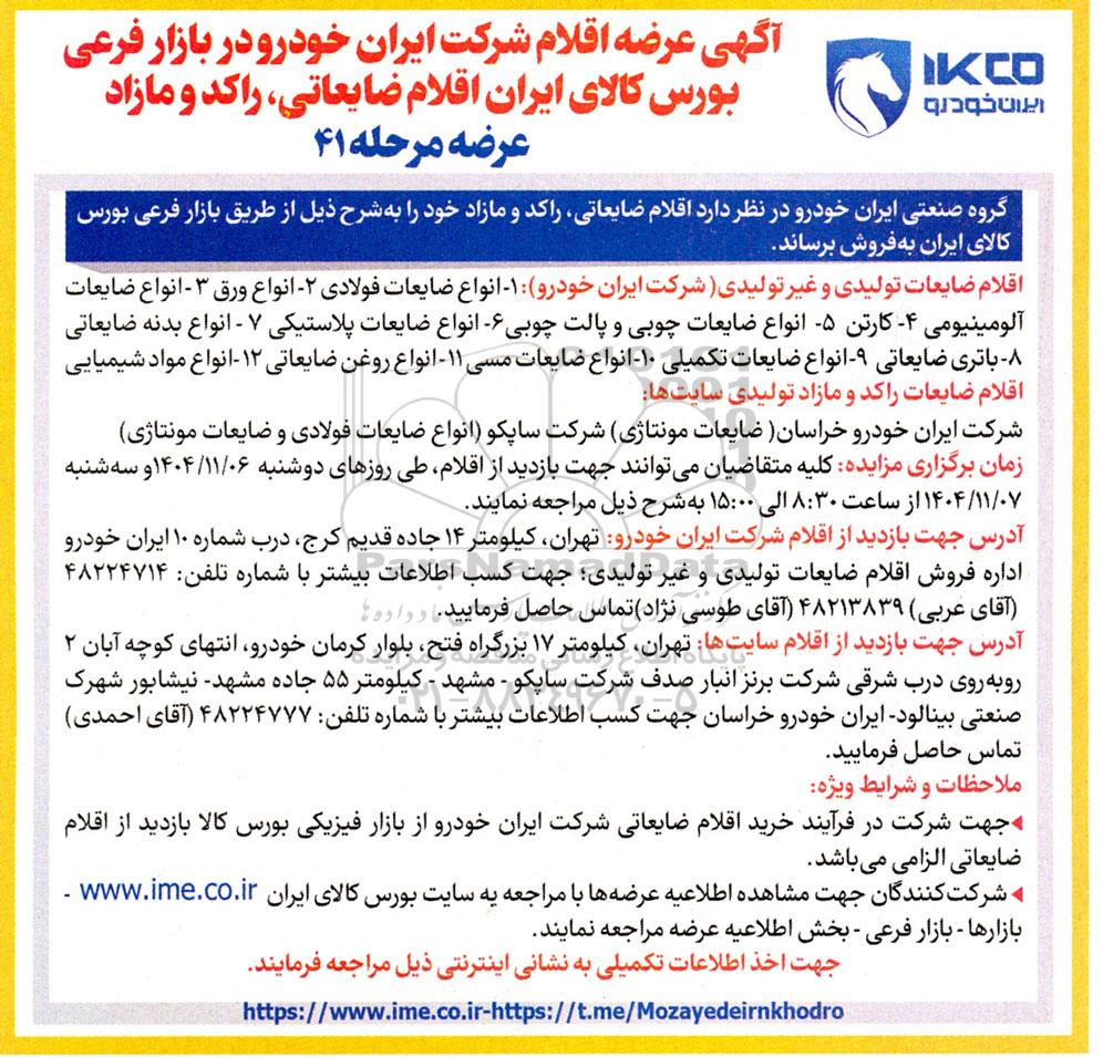 آگهی عرضه اقلام شرکت ایران خودرو در بازار فرعی بورس کالای ایران اقلام ضایعاتی، راکد و مازاد...., آگهی عرضه اقلام شرکت ایران خودرو در بازار فرعی بورس کالای ایران اقلام ضایعاتی، راکد و مازاد