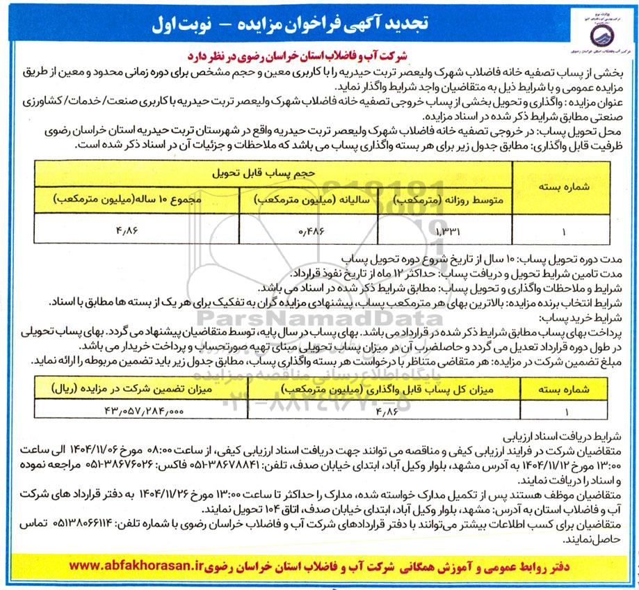 شرکت آب و فاضلاب خراسان رضوی در نظر دارد بخشی از پساب تصفیه خانه فاضلاب شهرک ولیعصر تربت حیدریه را با کاربری معین و حجم مشخص برای دوره زمانی محدود و معین از طریق مزایده عمومی و با شرایط ذیل به متقاضیان واجد شرایط واگذار نماید.