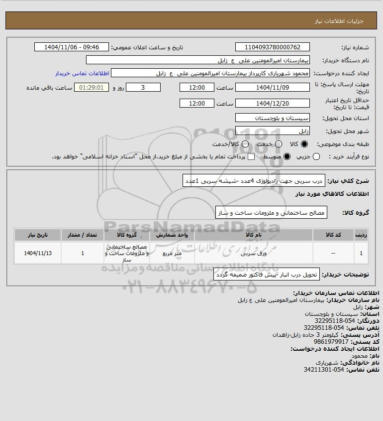 استعلام بها و موضوع استعلام استعلام درب سربی جهت رادیولوژی 4عدد -شیشه سربی 1عدد به اطلاع کلیه شرکتها و افراد متخصص واجد شرایط میرساند، آگهی گذار در نظر دارد از طریق استعلام بها، نسبت به انتخاب و دریافت پیشنهادات اقدام نماید. این استعلام با کد آگهی ثبت شده در سامانه خبرگزاری پارس نماد : 10192858 منتشر شده است. مشخصات استعلام : تاریخ شروع استعلام: 1404/11/06 آخرین مهلت ارسال پیشنهاد قیمت : 1404/11/09 و محل اجرای پروژه : استان مناقصات استان سیستان و بلوچستان میباشد. استعلام قیمت مورد درخواست : استعلام درب سربی جهت رادیولوژی 4عدد -شیشه سربی 1عدد با دستهبندیهای تخصصی و گروه های مرتبط : انواع در و پنجره, خدمات و تجهیزات آزمایشگاهی و پزشکی, صنایع شیشه, استعلام اطلاع رسانی میگردد.