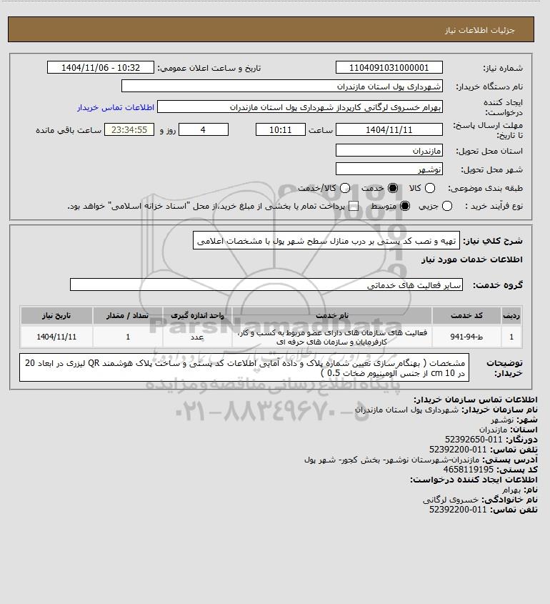 شرح کلی نیاز: تهیه و نصب کد پستی بر درب منازل سطح شهر پول با مشخصات اعلامی