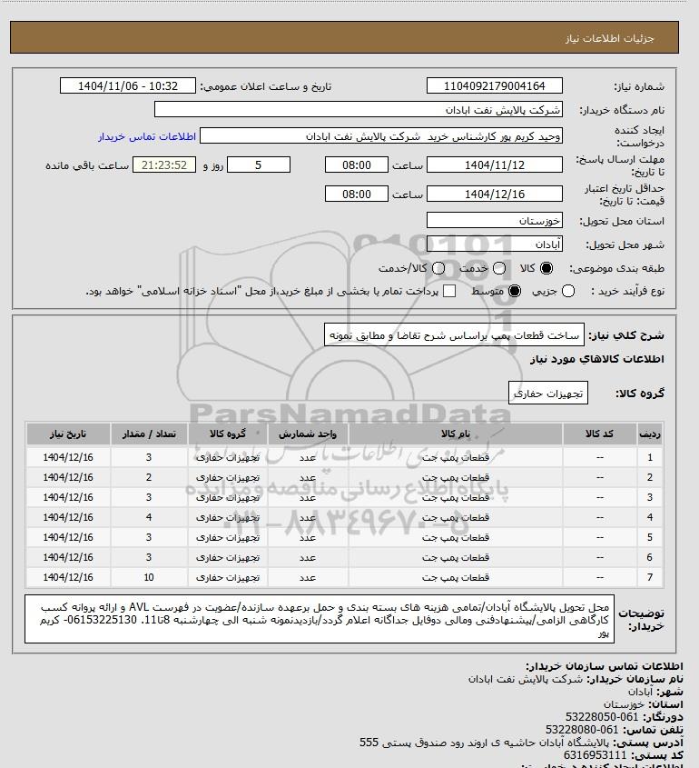 | 7 | -- | قطعات پمپ جت | عدد | تجهیزات حفاری | 10 | 1404/12/16 |
