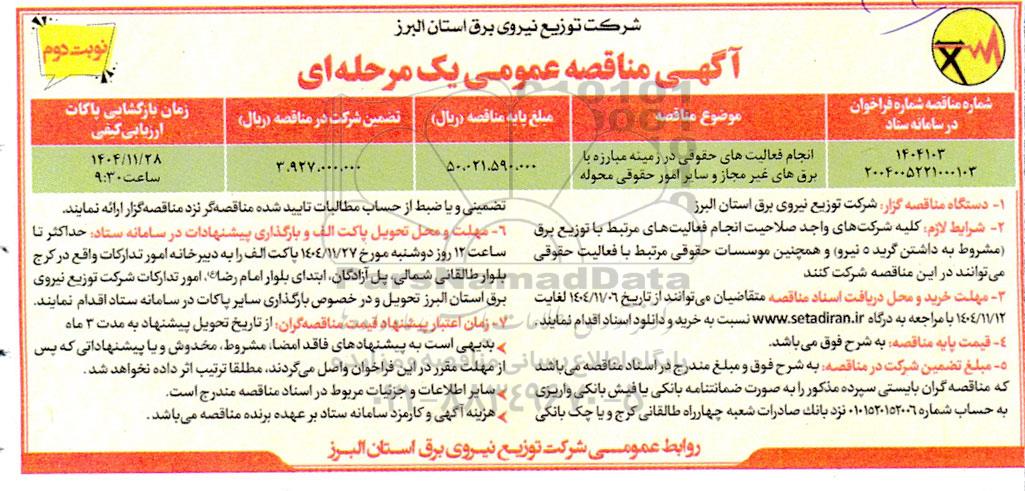 مناقصه انجام فعالیت های حقوقی در زمینه مبارزه با برق های غیرمجاز و سایر امور محوله- نوبت دوم از کلیه افراد متخصص و شرکتها واجد شرایط دعوت به عمل میآید در مناقصه با کد خبرگزاری پارس نماد: 10193560 شرکت نمایند.