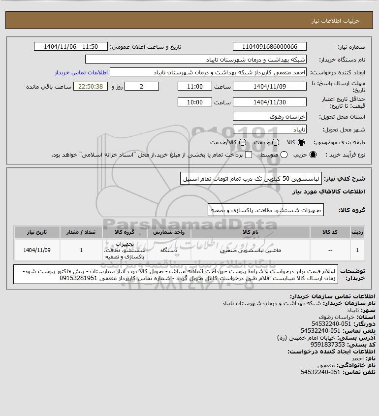 | 1 | -- | ماشین لباسشویی صنعتی | دستگاه | تجهیزات شستشو، نظافت، پاکسازی و تصفیه | 1 | 1404/11/09 |