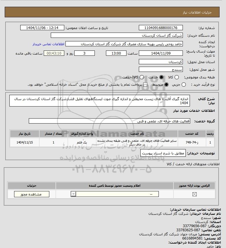 شرح کلی نیاز: اندازه گیری آلاینده های زیست محیطی و اندازه گیری صوت ایستگاههای تقلیل فشارشرکت گاز استان کردستان در سال 1404