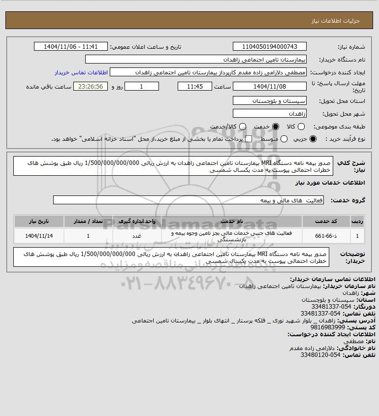 شرح کلی نیاز: صدور بیمه نامه دستگاه MRI بیمارستان تامین اجتماعی زاهدان به ارزش ریالی 1/500/000/000/000 ریال طبق پوشش های خطرات احتمالی پیوست به مدت یکسال شمسی