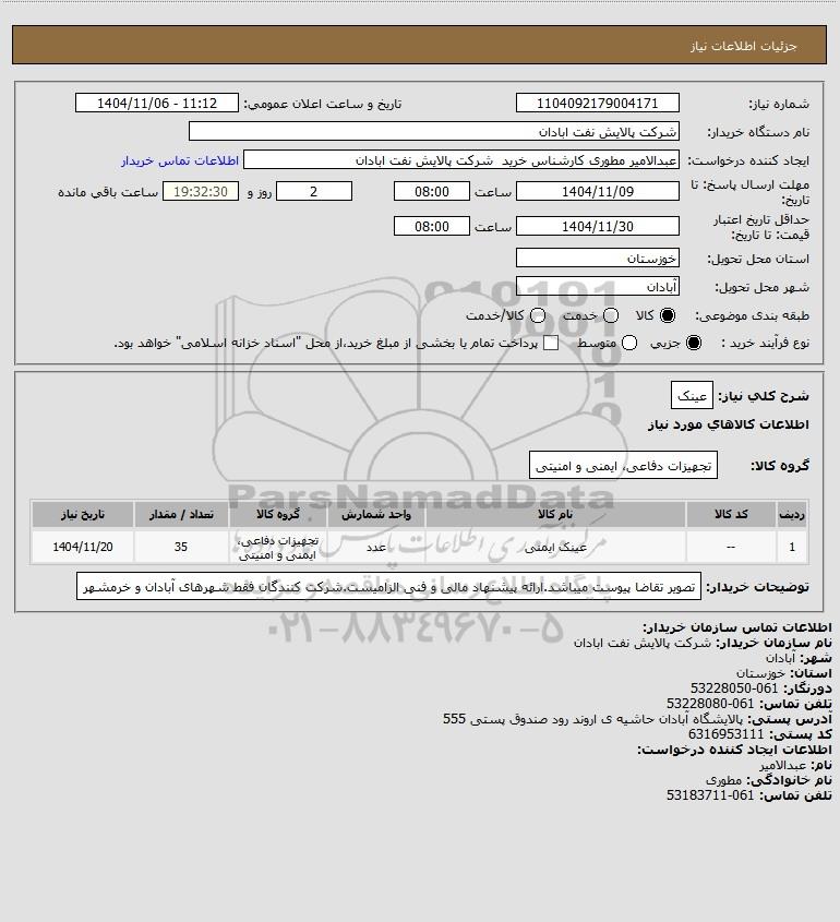 | 1 | -- | عینک ایمنی | عدد | تجهیزات دفاعی، ایمنی و امنیتی | 35 | 1404/11/20 |