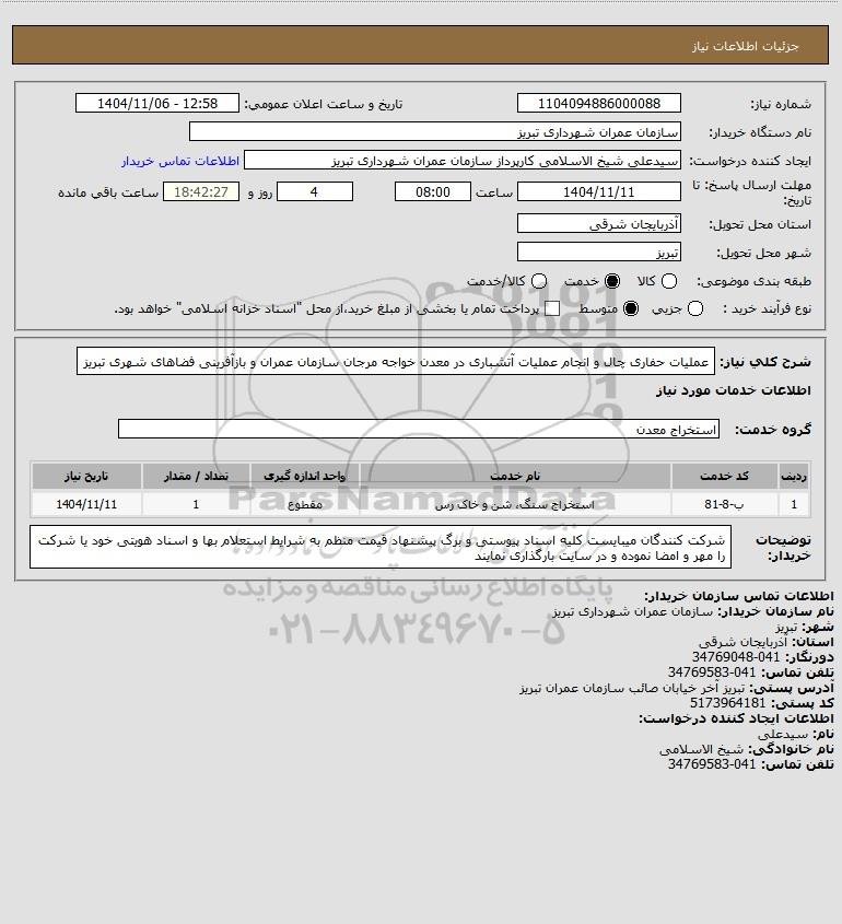 شرح کلی نیاز: عملیات حفاری چال و انجام عملیات آتشباری در معدن خواجه مرجان سازمان عمران و بازآفرینی فضاهای شهری تبریز