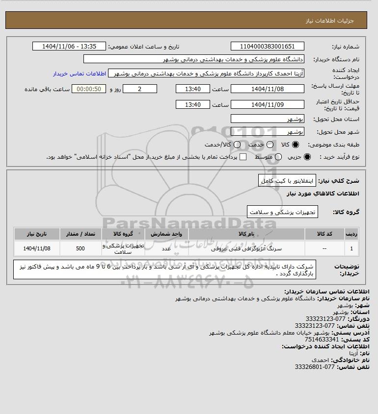 استعلام بها و موضوع استعلام استعلام اینفلایتور با کیت کامل به اطلاع کلیه شرکتها و افراد متخصص واجد شرایط میرساند، آگهی گذار در نظر دارد از طریق استعلام بها، نسبت به انتخاب و دریافت پیشنهادات اقدام نماید. این استعلام با کد آگهی ثبت شده در سامانه خبرگزاری پارس نماد : 10195211 منتشر شده است. مشخصات استعلام : تاریخ شروع استعلام: 1404/11/06 آخرین مهلت ارسال پیشنهاد قیمت : 1404/11/08 و محل اجرای پروژه : استان مناقصات استان بوشهر میباشد. استعلام قیمت مورد درخواست : استعلام اینفلایتور با کیت کامل با دستهبندیهای تخصصی و گروه های مرتبط : خدمات و تجهیزات آزمایشگاهی و پزشکی, استعلام اطلاع رسانی میگردد.