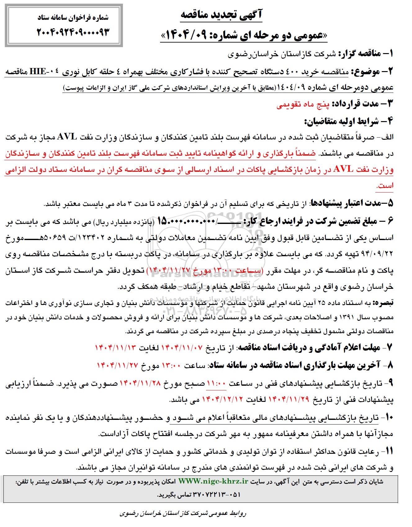شایان ذکر است دسترسی به متن این آگهی در سایت WWW.nigc-khrz.ir امکان پذیر بوده و در صورت نیاز به کسب اطلاعات بیشتر با تلفن 37072213-051 تماس بگیرید.