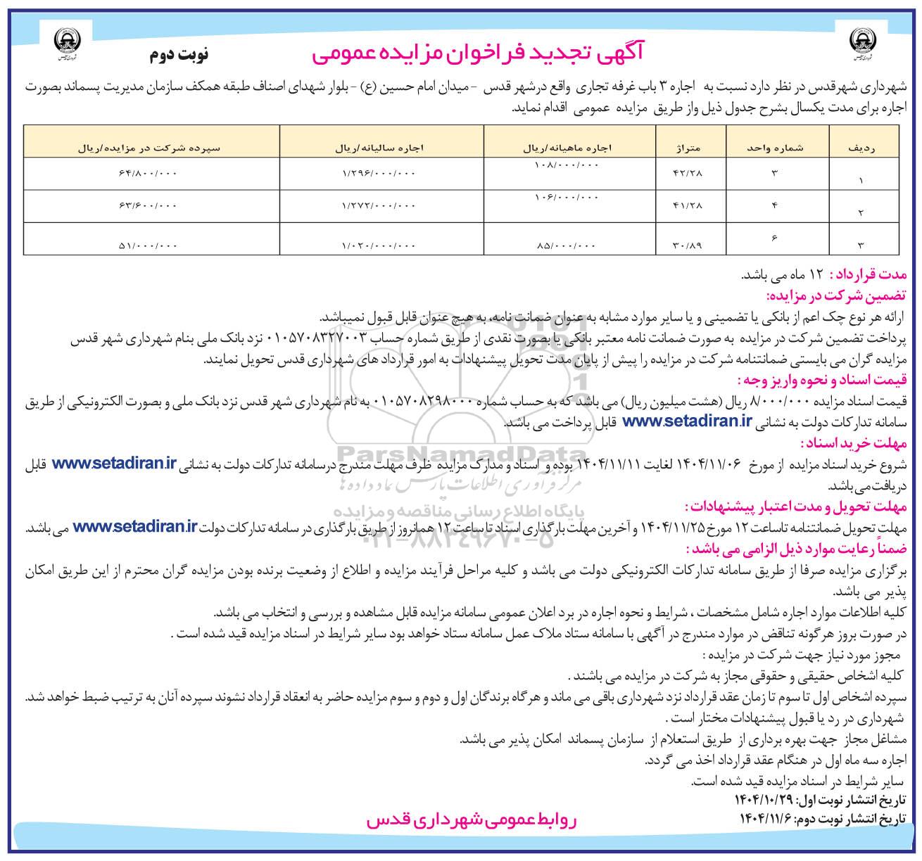 شهرداری شهر قدس در نظر دارد نسبت بهاجاره 3 باب غرفه تجاری واقع در شهر قدس میدان امام حسین (ع) بلوار شهدای اصناف طبقه همکف سازمان مدیریت پسماند بصورت اجاره برای مدت یکسال بشرح جدول ذیل و از طریق مزایده عمومی اقدام نماید