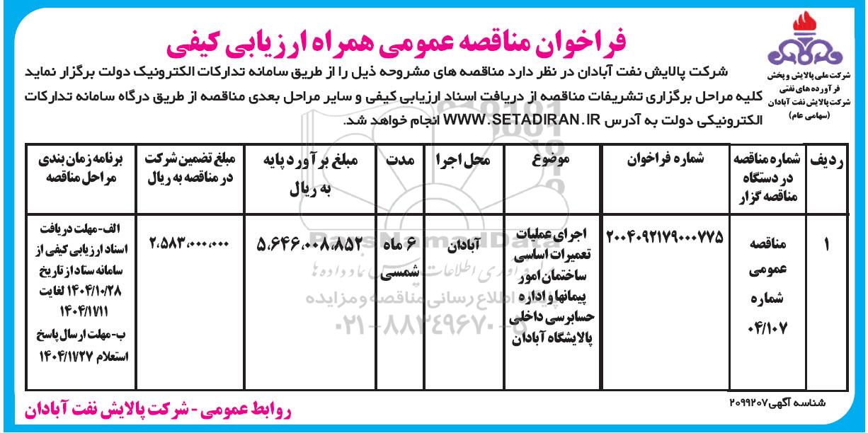 1 مناقصه عمومی شماره 04/107 2004092179000775 اجرای عملیات تعمیرات اساسی ساختمان امور پیمان ها و اداره حسابرسی داخلی پالایشگاه آبادان آبادان 6 ماه شمسی 5.646.008.852 2.583.000.000 الف- مهلت دریافت اسناد ارزیابی کیفی از سامانه ستاد از تاریخ 1404.10.28 لغایت 1404.11.11