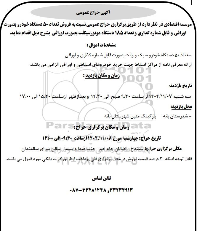 موسسه اقتصادی در نظر دارد از طریق برگزاری حراج عمومی نسبت به فروش تعداد 50 دستگاه خودرو بصورت اوراقی و قابل شماره گذاری و تعداد 185 دستگاه موتور سیکلت بصورت اوراقی بشرح ذیل اقدام نماید.