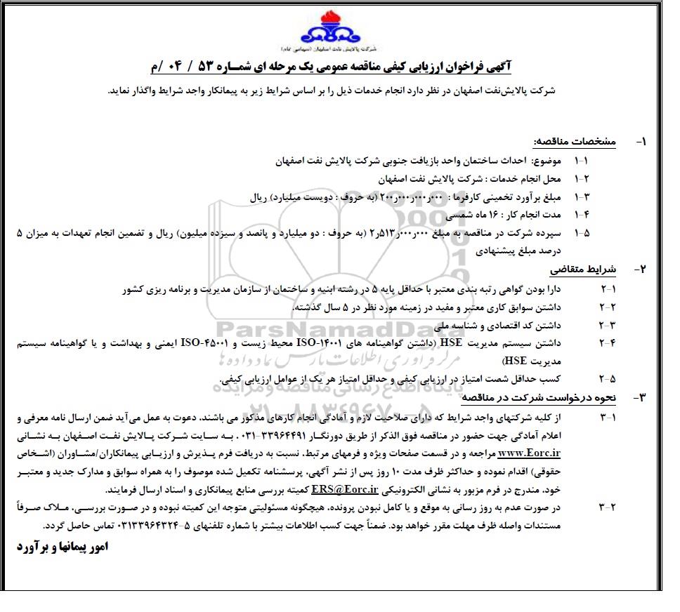 1 - 3 از کلیه شرکتهای واجد شرایط که دارای صلاحیت لازم و آمادگی انجام کارهای مذکور می باشند دعوت به عمل می آید ضمن ارسال نامه معرفی و اعلام آمادگی جهت حضور در مناقصه فوق الذکر از طریق دورنگار 33964491 - 031 به سایت شرکت پالایش نفت اصفهان به نشانی www.Eorc.ir مراجعه و در قسمت صفحات ویژه و فرمهای مرتبط. نسبت به دریافت فرم پذیرش و ارزیابی پیمانکاران/ مشاوران (اشخاص حقوقی) اقدام نموده و حداکثر ظرف مدت 10 روز پس از نشر آگهی، پرسشنامه تکمیل شده موصوف را به همراه سوابق و مدارک جدید و معتبر خود مندرج در فرم مزبور به نشانی الکترونیکی ERS@Eorc.ir کمیته بررسی منابع پیمانکاری و اسناد ارسال فرمایند.