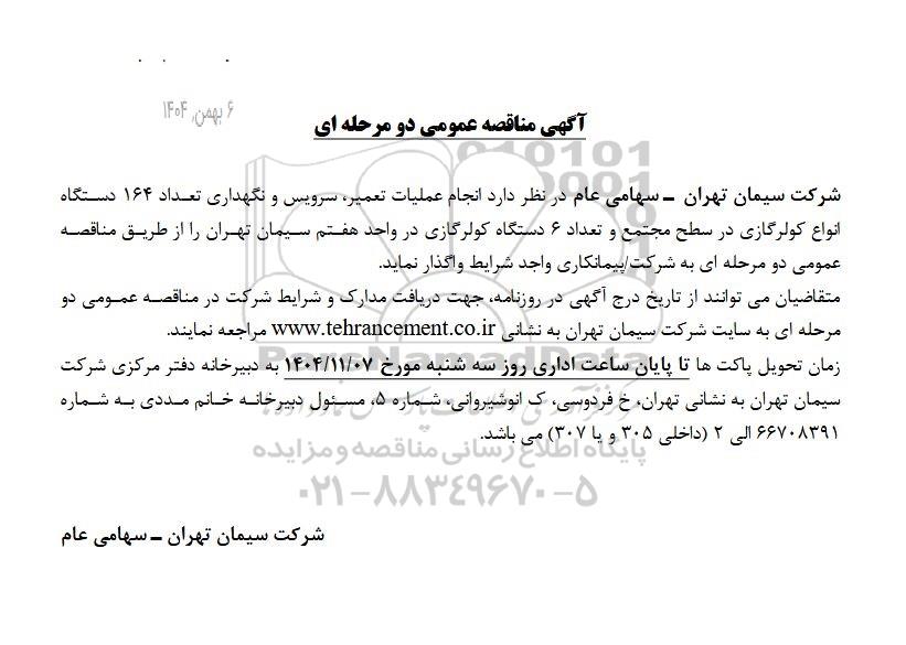 شرکت سیمان تهران - سهامی عام در نظر دارد انجام عملیات تعمیر، سرویس و نگهداری تعداد 164 دستگاه کولرگازی در سطح مجتمع و تعداد 6 دستگاه کولرگازی در واحد هفتم سیمان تهران را از طریق مناقصه عمومی دو مرحله ای به شرکت/ پیمانکاری واجد شرایط واگذار نماید.