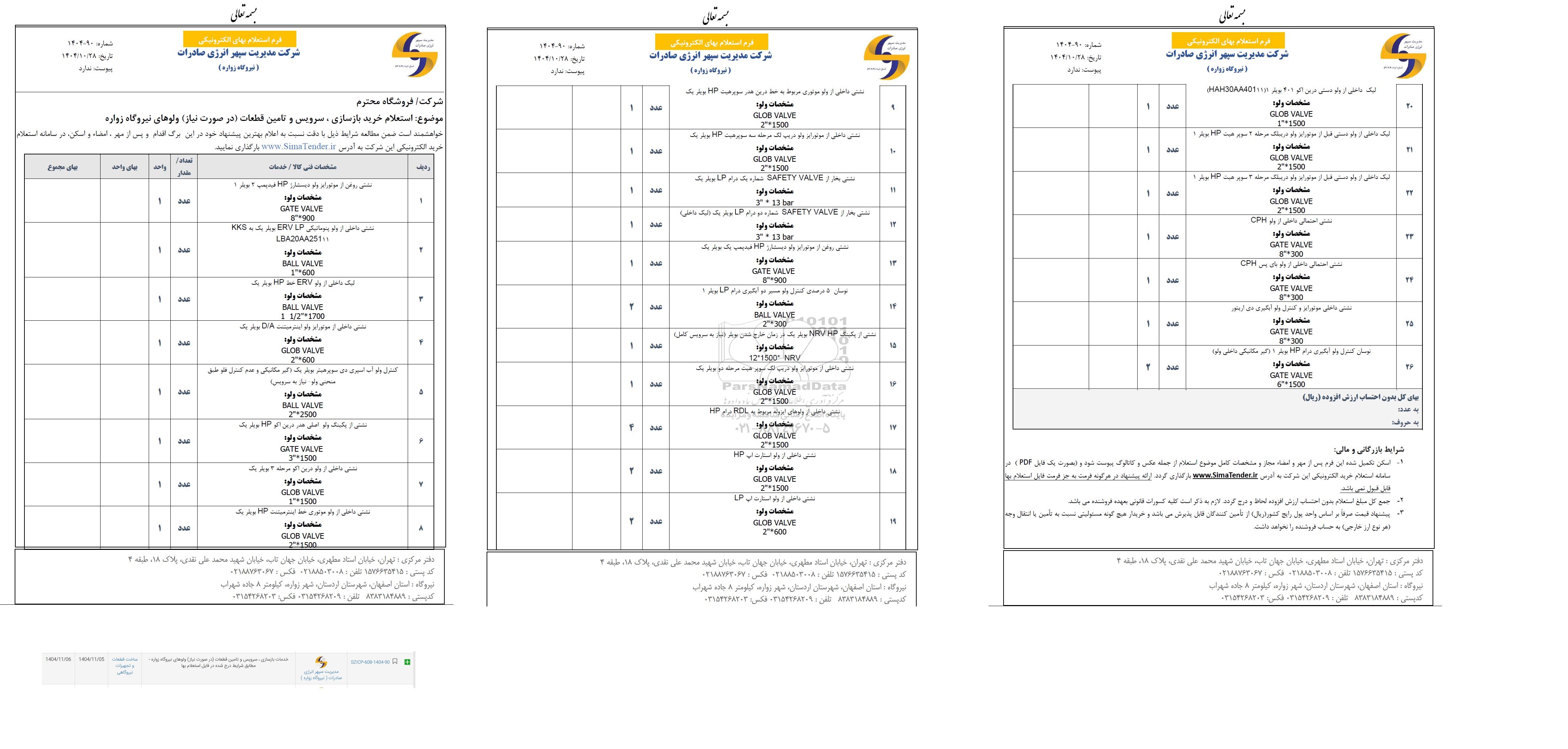 موضوع: استعلام خرید بازسازی ، سرویس و تامین قطعات (در صورت نیاز) ولوهای نیروگاه زواره