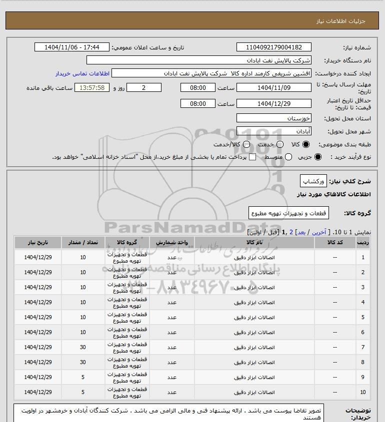 | 9 | -- | اتصالات ابزار دقیق | عدد | قطعات و تجهیزات تهویه مطبوع | 5 | 1404/12/29 |