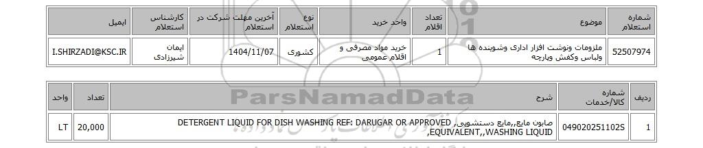 | 1 | 049020251102S | صابون مایع,,مایع دستشویی, DETERGENT LIQUID FOR DISH WASHING REF: DARUGAR OR APPROVED EQUIVALENT,,WASHING LIQUID, | 20,000 | LT |