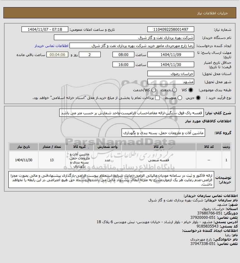 | 1 | -- | قفسه صنعتی | عدد | ماشین آلات و ملزومات حمل، بسته بندی و نگهداری | 13 | 1404/11/30 |