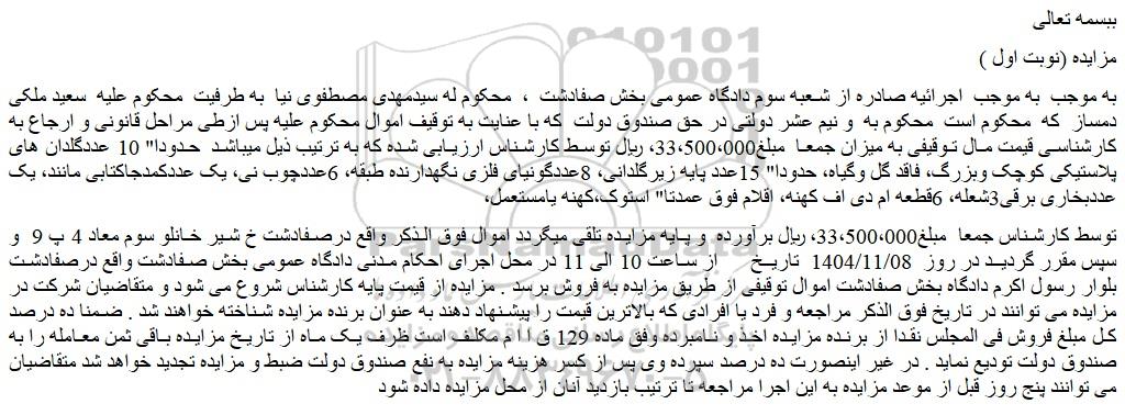 به موجب  به موجب  اجرائیه صادره از شعبه سوم دادگاه عمومی بخش صفادشت  ،  محکوم له سیدمهدی مصطفوی نیا  به طرفیت  محکوم علیه  سعید ملکی دمساز  که  محکوم است  محکوم به  و نیم عشر دولتی در حق صندوق دولت  که با عنایت به توقیف اموال محکوم علیه پس ازطی مراحل قانونی و ارجاع به کارشناسی قیمت مال توقیفی به میزان جمعا  مبلغ33،500،000، ریال توسط کارشناس ارزیابی شده که به ترتیب ذیل میباشد  حدودا" 10 عددگلدان های پلاستیکی کوچک وبزرگ، فاقد گل وگیاه، حدودا" 15عدد پایه زیرگلدانی، 8عددگونیای فلزی نگهدارنده طبقه، 6عددچوب نی، یک عددکمدجاکتابی مانند، یک عددبخاری برقی3شعله، 6قطعه ام دی اف کهنه، اقلام فوق عمدتا" استوک،کهنه یامستعمل،