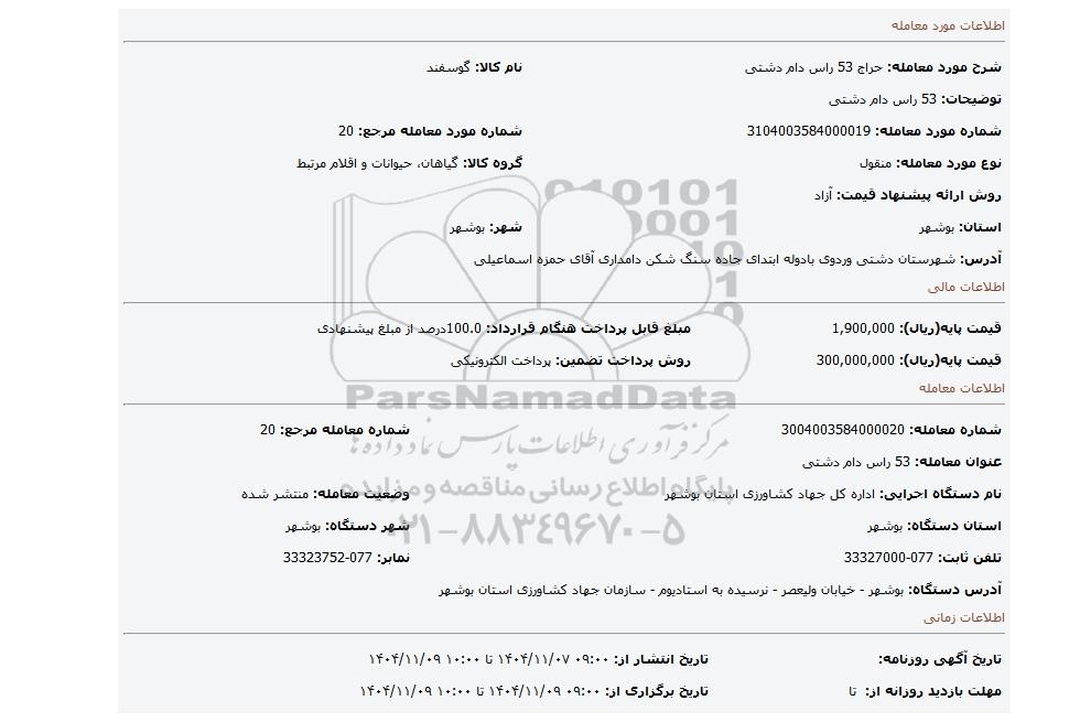نام دستگاه اجرایی: اداره کل جهاد کشاورزی استان بوشهروضعیت معامله: منتشر شده