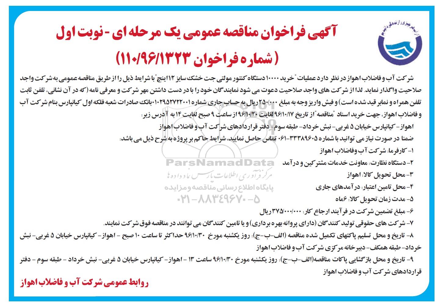 شرکت آب و فاضلاب اهواز در نظر دارد عملیات خرید 10000 دستگاه کنتور مولتی جت خشک سایز 1/2 اینچ )با شرایط ذیل از طریق مناقصه عمومی به شرکت واجد صلاحیت واگذار نماید. لذا از شرکتهای واجد صلاحیت دعوت می شود، نمایندگان خود را با در دست داشتن مهر شرکت و معرفی نامه (که در آن نشانی، تلفن ثابت، تلفن همراه و نمابر قید شده است) و فیش واریز وجه به مبلغ 250.000 ریال به حساب جاری شماره 0102952722001 نزد بانک صادرات شعبه فلکه اول کیانپارس به نام شرکت آب و فاضلاب اهواز، جهت خرید اسناد مناقصه از تاریخ 96.10.17 لغایت 96.10.20 از ساعت 9 صبح لغایت 14 به آدرس زیر: اهواز، کیانپارس، خیابان پنجم غربی - نبش خرداد - طبقه سوم - دفتر قراردادهای شرکت آب و فاضلاب اهواز