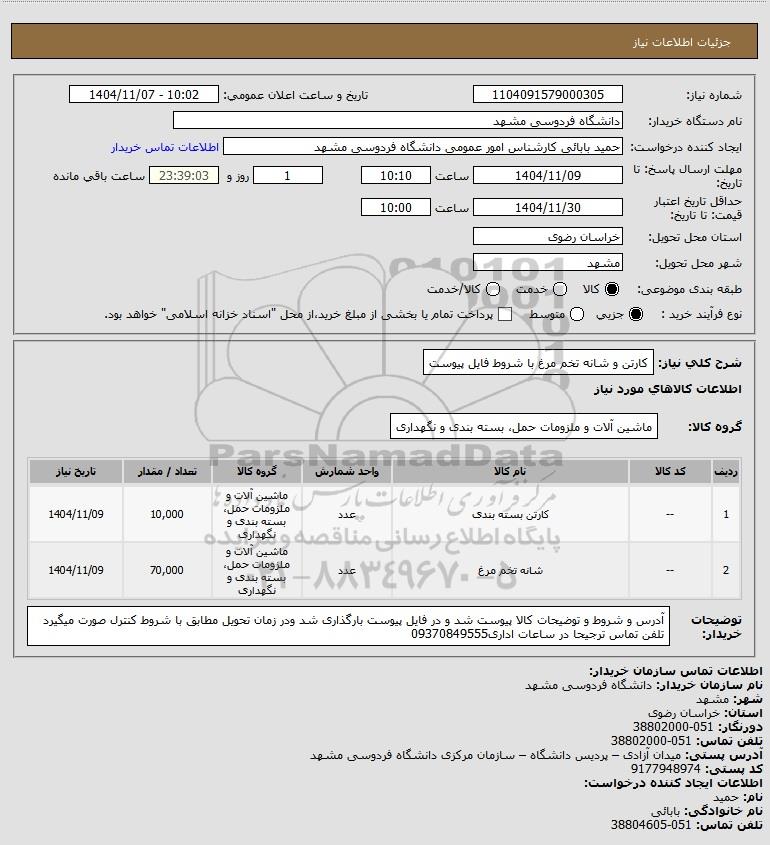 شرح کلی نیاز: کارتن و شانه تخم مرغ با شروط فایل پیوست