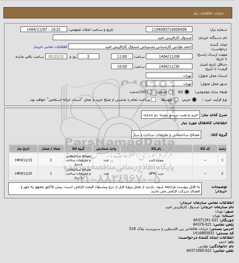 شرح کلی نیاز: خرید و نصب درب و پنجره- دو جداره-