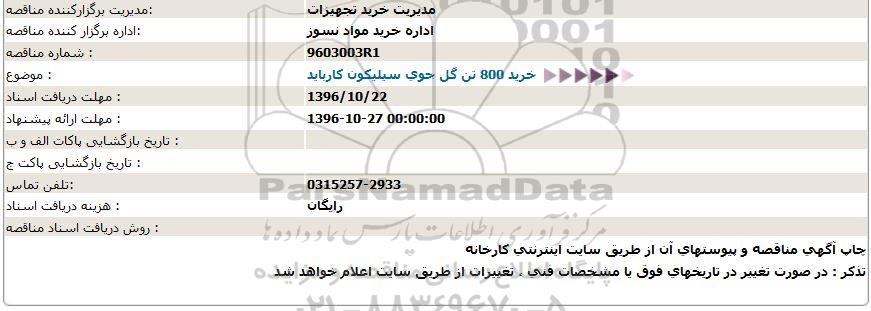 مناقصه خرید 800 تن گل جوی سیلیکون از کلیه افراد متخصص و شرکت‌ها واجد شرایط دعوت به عمل می‌آید در مناقصه با کد خبرگزاری پارس نماد: 1020086 شرکت نمایند. این مناقصه در تاریخ 1396/10/18 شروع و مهلت آن تا تاریخ 1396/10/22 میباشد.