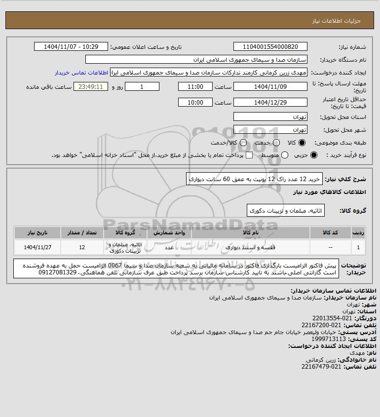 شرح کلی نیاز: خرید 12 عدد راک 12 یونیت به عمق 60 سانت دیواری