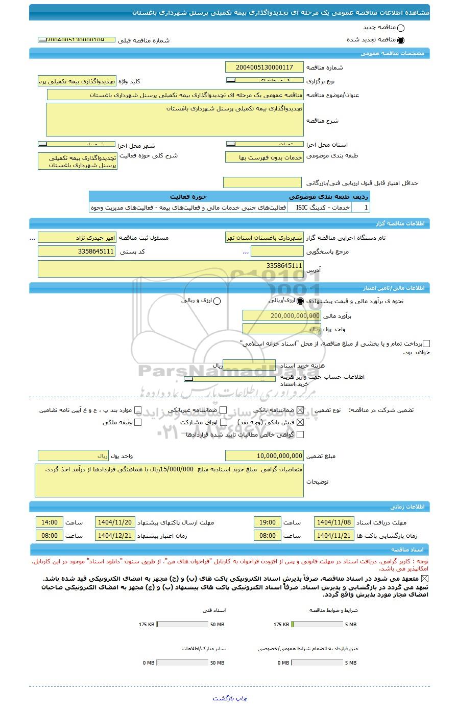| شرح مناقصه | تچدیدواگذاری بیمه تکمیلی پرسنل شهرداری باغستان | ||||||||