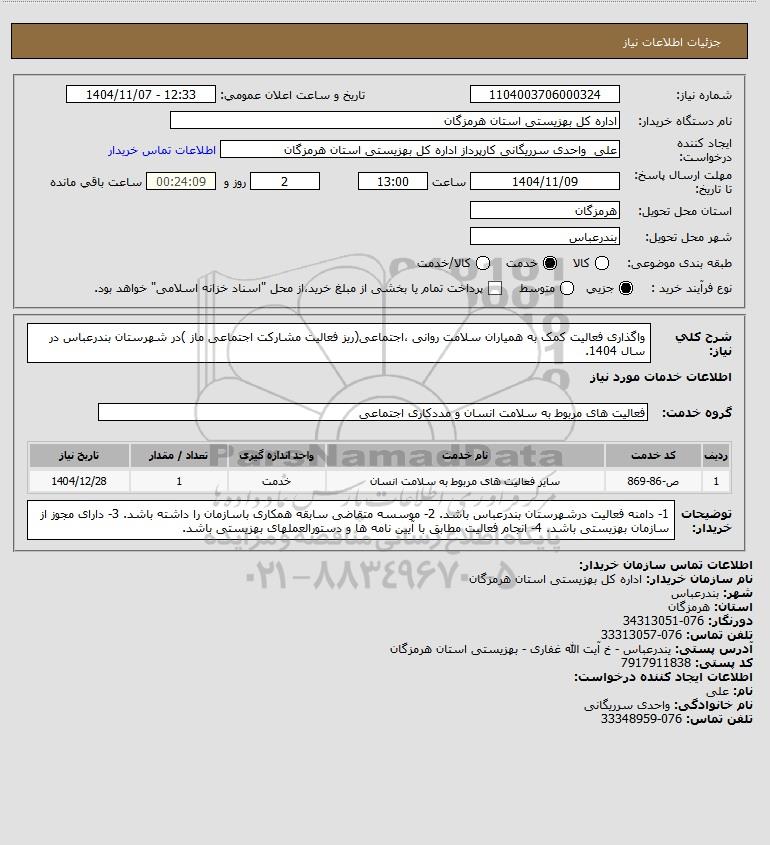 شرح کلی نیاز: واگذاری فعالیت کمک به همیاران سلامت روانی ،اجتماعی(ریز فعالیت مشارکت اجتماعی ماز )در شهرستان بندرعباس در سال 1404.