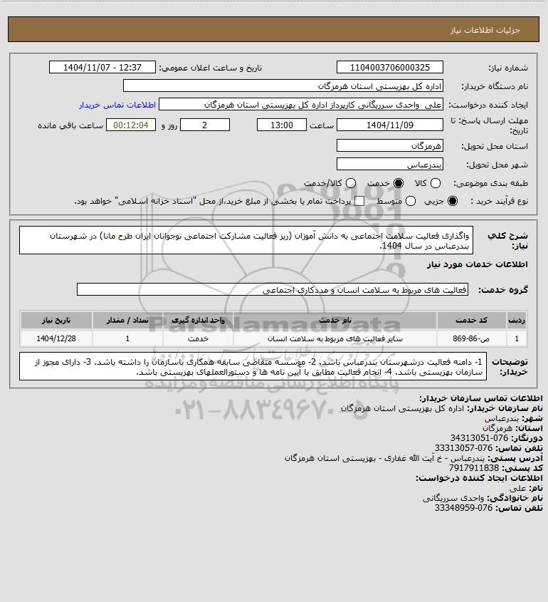شرح کلی نیاز: واگذاری فعالیت سلامت اجتماعی به دانش آموزان (ریز فعالیت مشارکت اجتماعی نوجوانان ایران طرح مانا) در شهرستان بندرعباس در سال 1404.