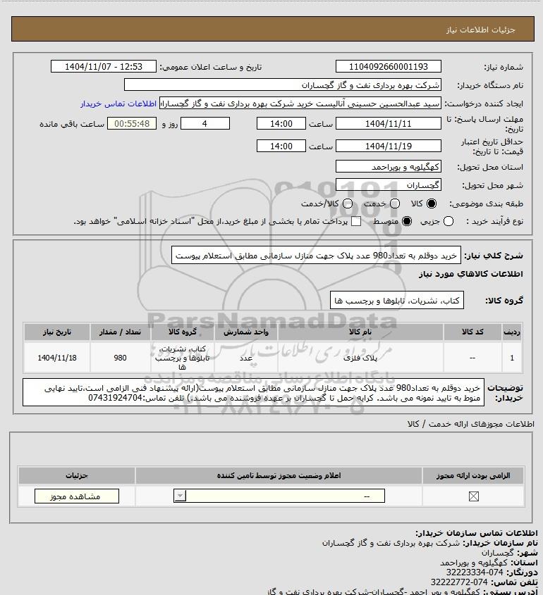 شرح کلی نیاز: خرید دوقلم به تعداد980 عدد پلاک جهت منازل سازمانی مطابق استعلام پیوست