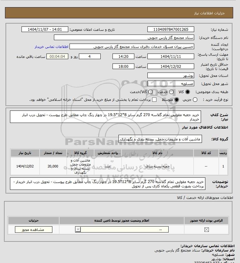 استعلام بها و موضوع استعلام استعلام خرید جعبه مقوایی تمام گلاسه 270 گرم سایز 8*12*19.5 در چهار رنگ چاپ مطابق طرح پیوست - تحویل درب انبار خریدار به اطلاع کلیه شرکت‌ها و افراد متخصص واجد شرایط می‌رساند، آگهی گذار در نظر دارد از طریق استعلام بها، نسبت به انتخاب و دریافت پیشنهادات اقدام نماید. این استعلام با کد آگهی ثبت شده در سامانه خبرگزاری پارس نماد : 10203377 منتشر شده است. مشخصات استعلام : تاریخ شروع استعلام: 1404/11/07 آخرین مهلت ارسال پیشنهاد قیمت : 1404/11/11 و محل اجرای پروژه : استان مناقصات استان بوشهر میباشد. استعلام قیمت مورد درخواست : استعلام خرید جعبه مقوایی تمام گلاسه 270 گرم سایز 8*12*19.5 در چهار رنگ چاپ مطابق طرح پیوست - تحویل درب انبار خریدار با دسته‌بندی‌های تخصصی و گروه های مرتبط : صنایع بسته بندی, طراحی چاپ و تبلیغات, کارتن, استعلام اطلاع رسانی میگردد.