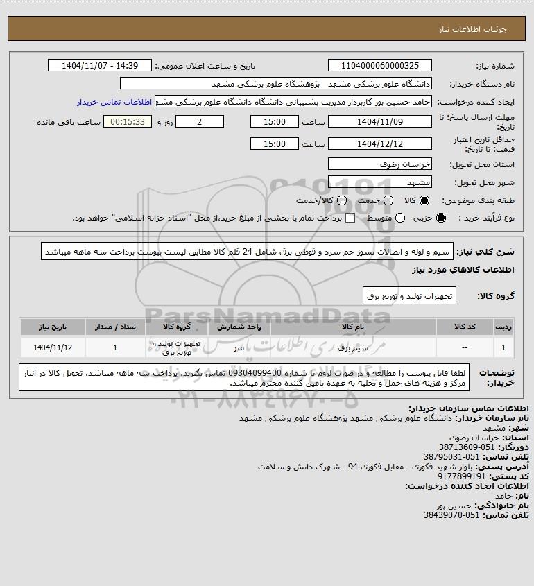شرح کلی نیاز: سیم و لوله و اتصالات نسوز خم سرد و قوطی برق شامل 24 قلم کالا مطابق لیست پیوست-پرداخت سه ماهه میباشد