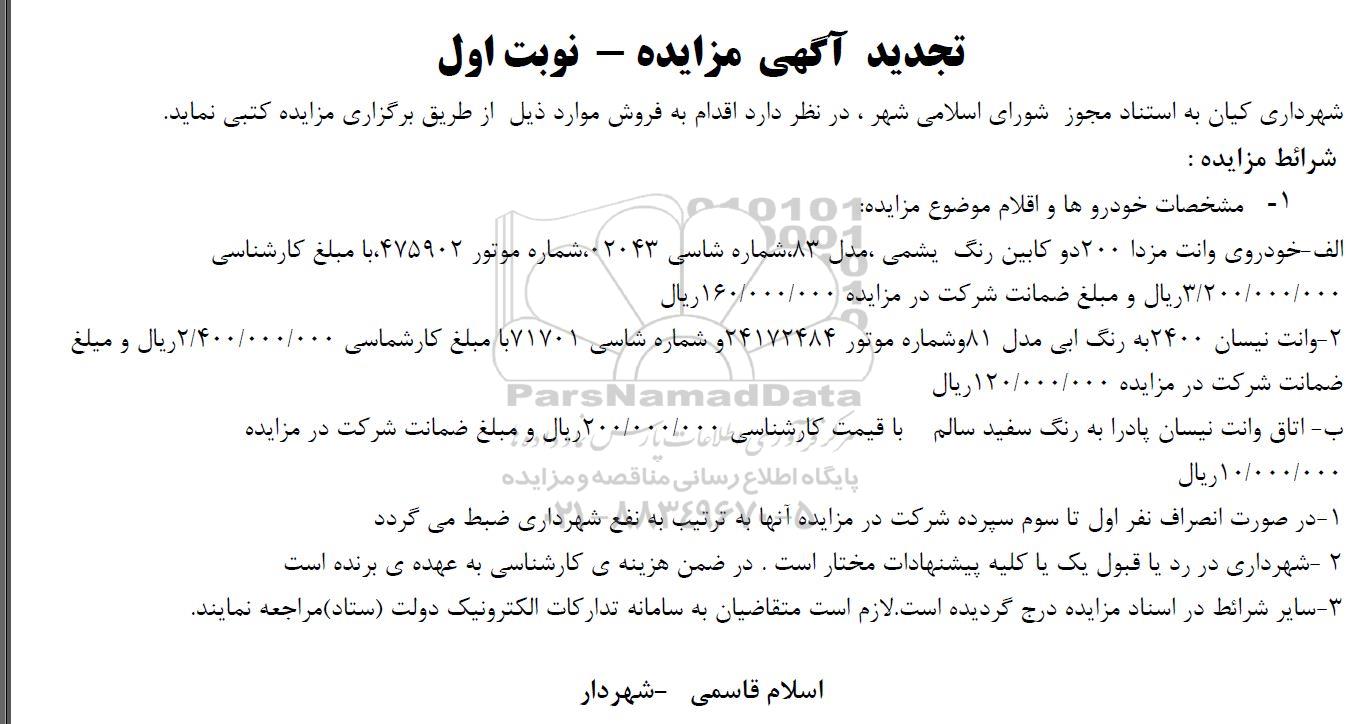ب - اتاق وانت نیسان پادرا به رنگ سفید سالم با قیمت کارشناسی 200.000.000 ریال و مبلغ ضمانت شرکت در مزایده 10.000.000 ریال