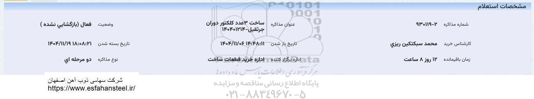 عنوان مذاکره : استعلام ساخت سه عدد کلکتور دوران جرثقیل 140401214