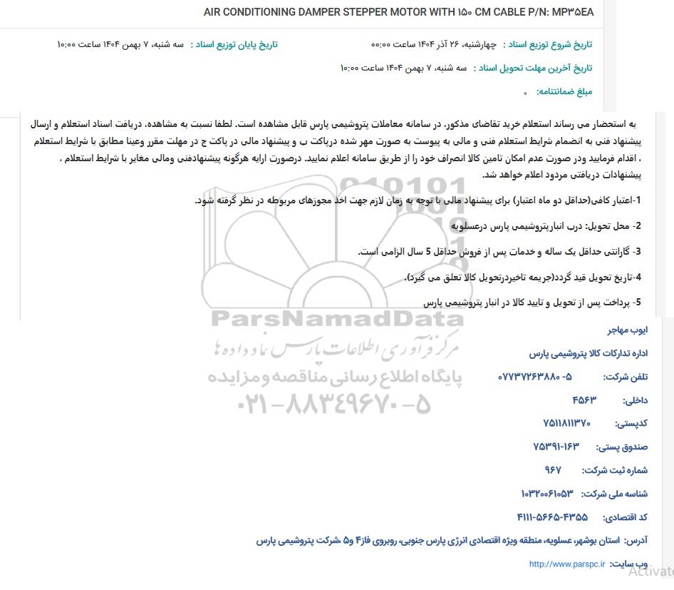 به استحضار می رساند استعلام خرید تقاضای مذکور در سامانه معاملات پتروشیمی پارس قابل مشاهده است. لطفا نسبت به مشاهده دریافت اسناد استعلام و ارسال پیشنهاد فنی به انضمام شرایط استعلام فنی و مالی به پیوست به صورت مهر شده در پاکت ب و پیشنهاد مالی در پاکت ج در مهلت مقرر وعینا مطابق با شرایط استعلام اقدام فرمایید و در صورت عدم امکان تامین کالا انصراف خود را از طریق سامانه اعلام نمایید. در صورت ارایه هرگونه پیشنهادفنی و مالی مغایر با شرایط استعلام . پیشنهادات دریافتی مردود اعلام خواهد شد.