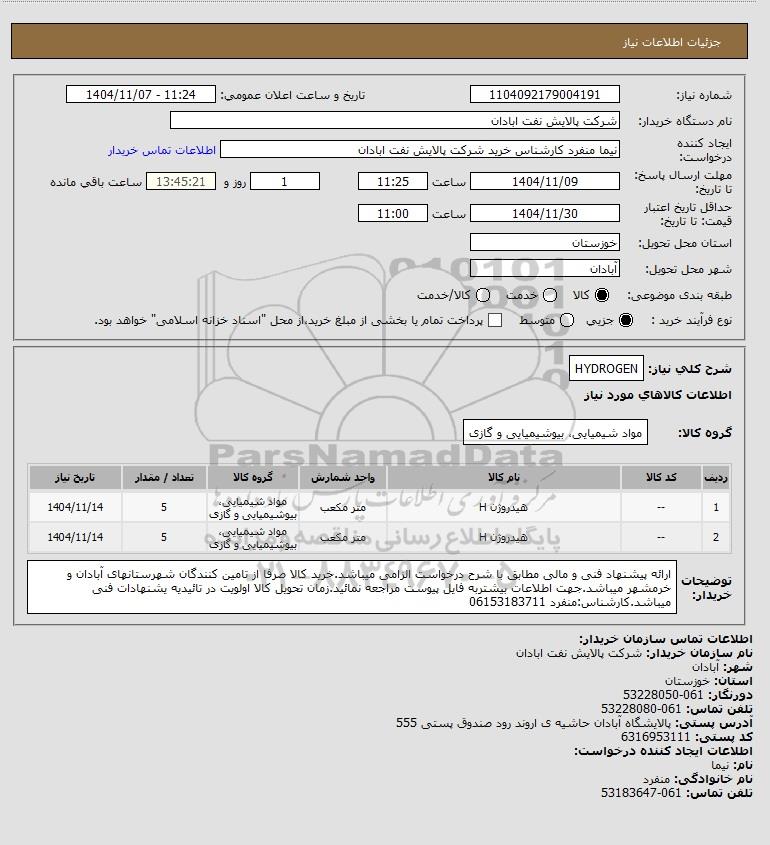1 -- هیدروژن H متر مکعب مواد شیمیایی، بیوشیمیایی و گازی 5 1404/11/14