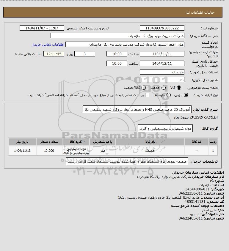 شرح کلی نیاز: آمونیاک 25 درصد صنعتی NH3 واحدهای بخار نیروگاه شهید سلیمی نکا