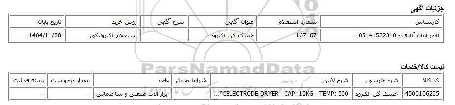 | ناصر امان آبادی - 05141522310 | 167167 | خشک کن الکترود | استعلام الکترونیکی | 1404/11/08 |