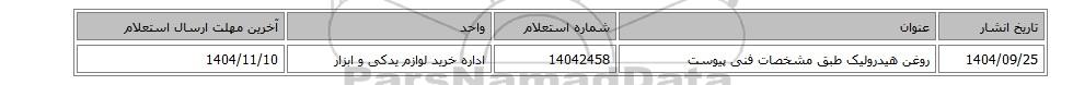 | 1404/09/25 | روغن هیدرولیک طبق مشخصات فنی پیوست | 14042458 | اداره خرید لوازم یدکی و ابزار | 1404/11/10 |