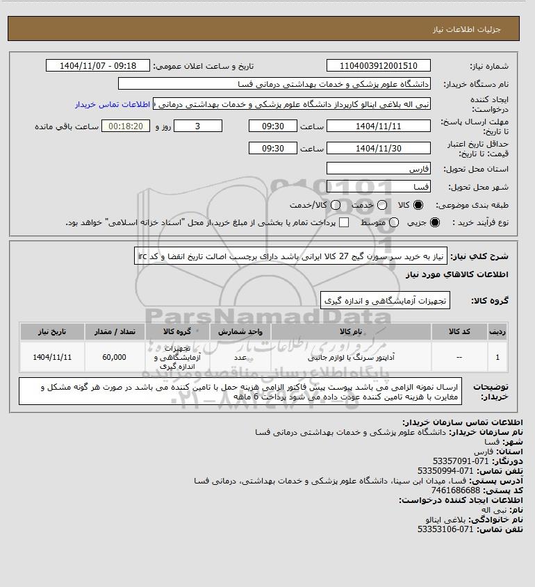شرح کلی نیاز: نیاز به خرید سر سوزن گیج 27 کالا ایرانی باشد دارای برچسب اصالت تاریخ انقضا و کد irc