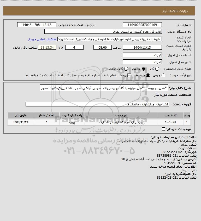 شرح کلی نیاز: *شرح در پیوست *طرح مبارزه با آفات و بیماریهای عمومی گیاهی شهرستان فیروزکوه*نوبت سوم