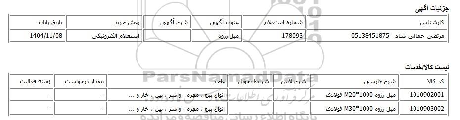 | مرتضی جمالی شاد - 05138451875 | 178093 | میل رزوه | استعلام الکترونیکی | 1404/11/08 |