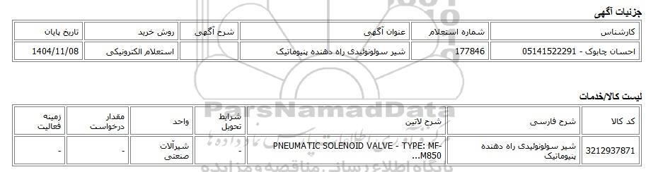 | احسان چابوک - 05141522291 | 177846 | شیر سولونوئیدی راه دهنده پنیوماتیک | استعلام الکترونیکی | 1404/11/08 |
