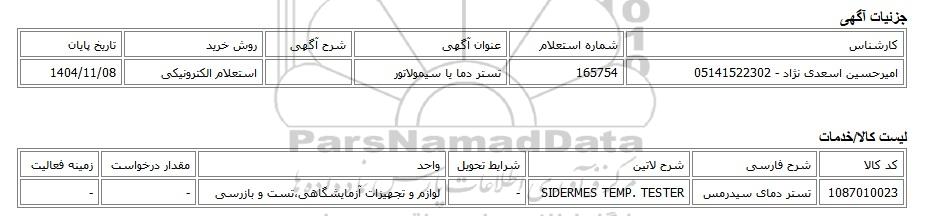 | امیرحسین اسعدی نژاد - 05141522302 | 165754 | تستر دما یا سیمولاتور | استعلام الکترونیکی | 1404/11/08 |