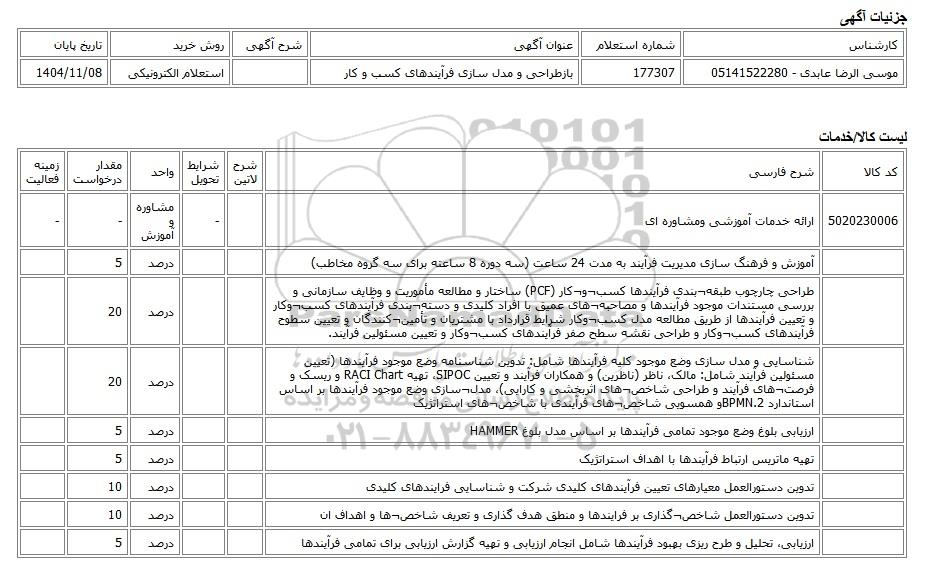| موسی الرضا عابدی - 05141522280 | 177307 | بازطراحی و مدل سازی فرآیندهای کسب و کار | استعلام الکترونیکی | 1404/11/08 |