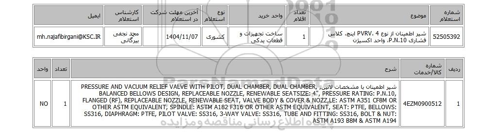 | 52505392 | شیر اطمینان از نوع PVRV، 4 اینچ، کلاس فشاری P.N.10، واحد اکسیژن | 1 | ساخت تجهیزات و قطعات یدکی | کشوری | 1404/11/07 | محمد نجفی بیرگانی | mh.najafibirgani@KSC.IR |